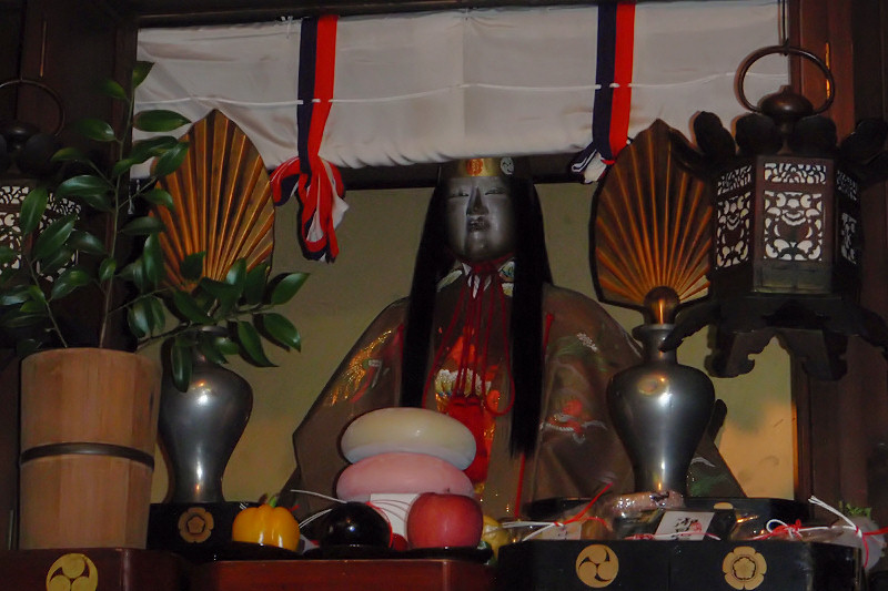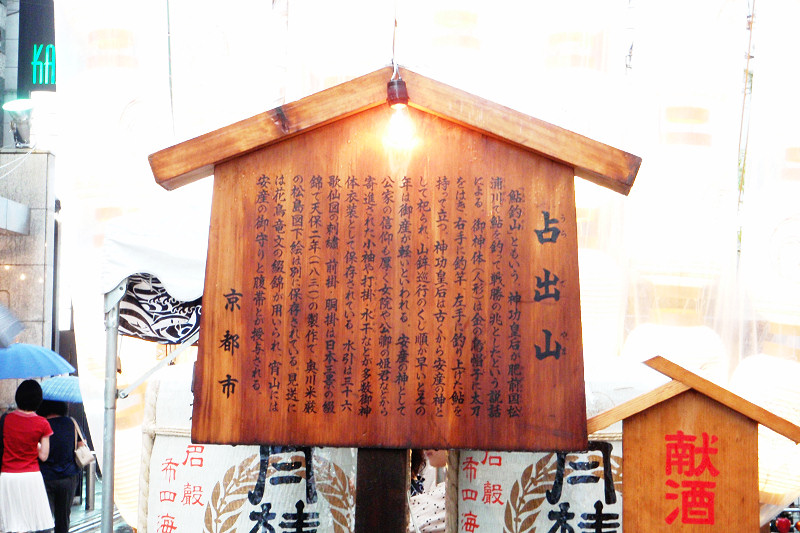 『 「鮎釣山」ともいう。神功皇后が肥前国松浦川で鮎を釣って戦勝の兆としたという説話による。御神体(人形)は金の烏帽子に太刀をはき,右手に釣竿,左手に釣り上げた鮎を持って立つ。神功皇后は古くから安産の神として祀られ,山鉾巡行のくじ順が早いとその年は御産が軽いといわれる。安産の神として公家の信仰も厚く女院や公卿の姫君などから寄進された小袖や打掛,水干などが多数御神体衣装として保存されている。水引は三十六歌仙図の刺繍,前掛,胴掛は日本三景の綴錦で天保二年(一八三一)の製作で,奥川米厳の松島図下絵は別に保存されている。見送には花鳥竜文の綴錦が用いられ,宵山には安産の御守りと腹帯とが授与される。 』 『占出山の駒札より』 友釣り