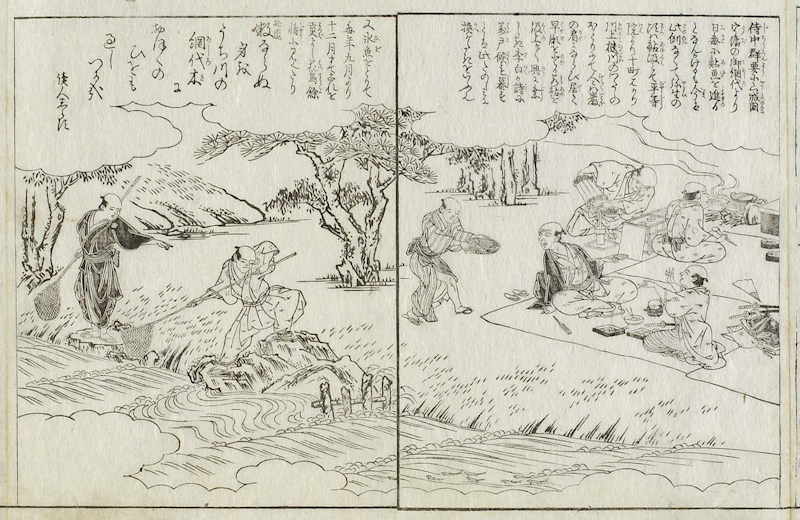 『侍中群要に山城国宇治の御網代より日毎に鮎魚を進るとなんかけるも,今は此例なくて,弥生の頃は鮎汲とて平等院より十町ばかり川上櫃川のわたしのほとりにて,人々は巌の肩にならび居て,早瀬を登る若鮎を汲上ゲ汲上ゲ興に乗じき。李白が詩に万戸候も幕すとは此たのしみに換がたきをいふ也。又氷魚をとりて毎年九月より十二月までこれを貢よし,花鳥余情に見えたり。