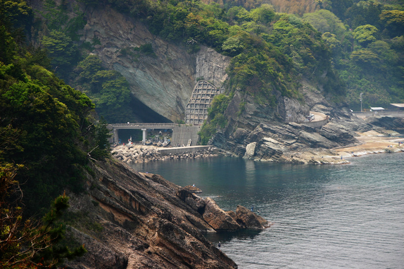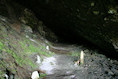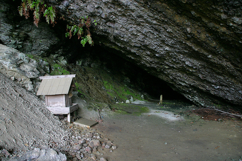 凝灰岩の絶崖にできたこの洞窟は,東に向かって開口しており,幅三○m,奥行き三○mあります。