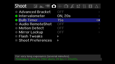 - インターバル撮影をしないときは,8. または9. の Intervalometer,Bulb Timer 項目を無効にしておく。