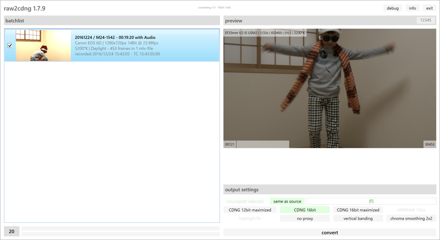 - 左側の batchlist の欄に MLV ファイルをドラッグ&ドロップする。